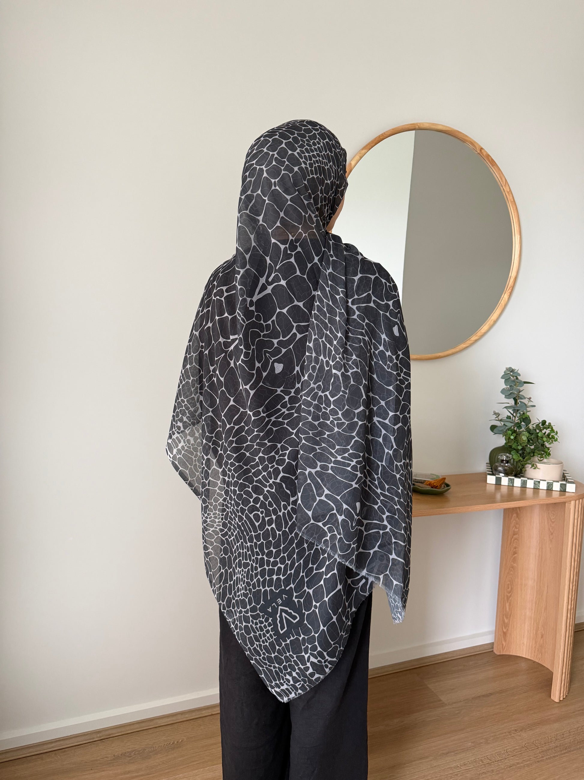 The Midnight Black Crocodile Hijab is crafted from 100% signature modal fabric, measuring 180 x 90 cm. Its frayed edges enhance its aesthetic appeal, while the intricate crocodile print adds a unique touch. Modal's breathable properties ensure comfort, making it suitable for various climates.